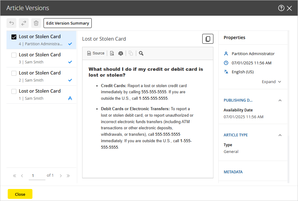 In the Article Versions window, select the article version for which you want to add or edit the summary.