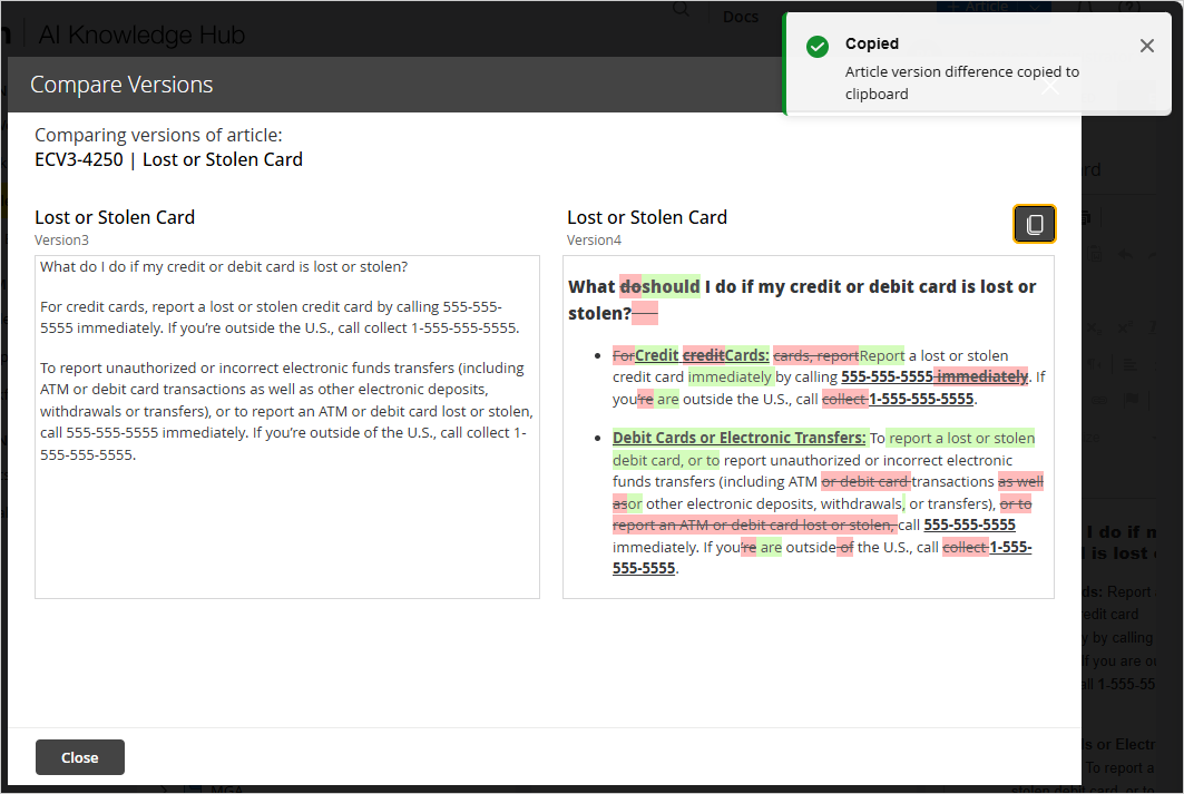 The Compare Versions window appears and highlights the various changes in the content between the article versions.