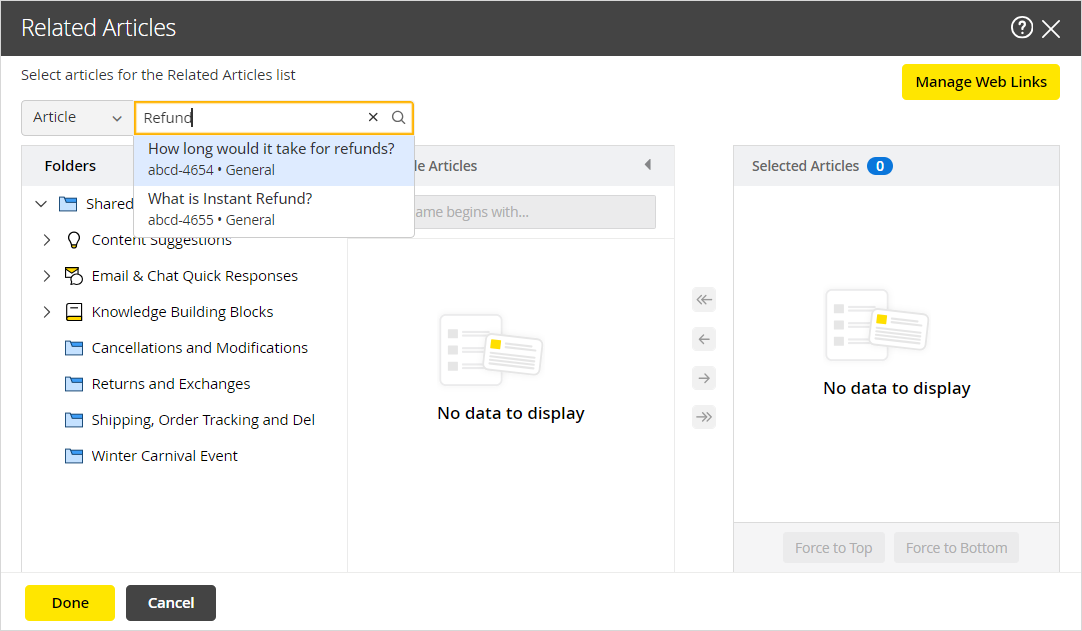 button.If you remove a web link from the Selected Articles list and click the Done button, the web link gets deleted.