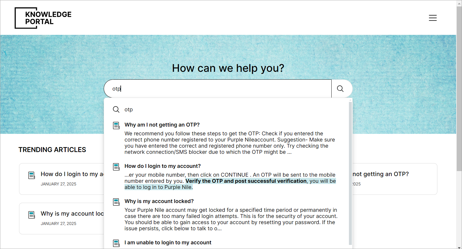 The search results are displayed in the dropdown menu based on the meaning of the words typed rather than a simple keyword-matching solution. The article suggestions displayed in the dropdown menu are closest to matching the search query’s meaning.